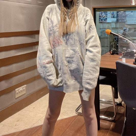 Street hip-hop retro flame print loose hooded plus velvet sweatshirt