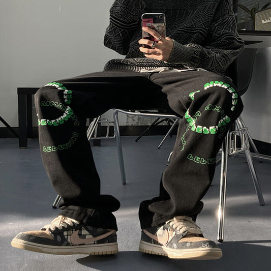 Letter Jeans Men's Straight Loose-fitting Wide-leg Trousers