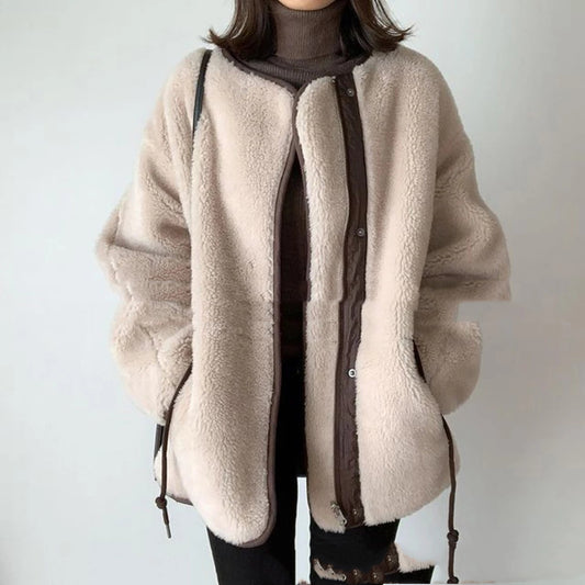 Plush Stitching Round Neck Zipper Loose Long Sleeve Fashion Women