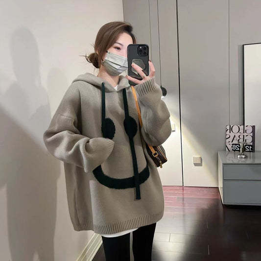 Soft Glutinous Beige Smiley Face Hooded Sweater Women's Autumn And Winter New Lazy