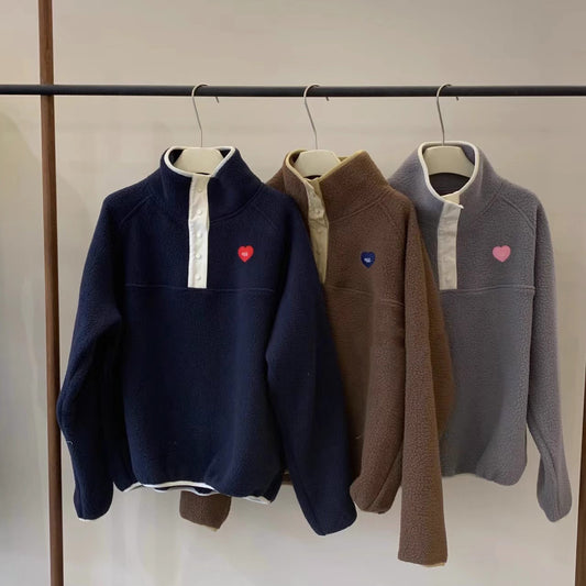 Women's Stand Collar Half Zip Love Embroidery Lamb Wool Sweatshirt
