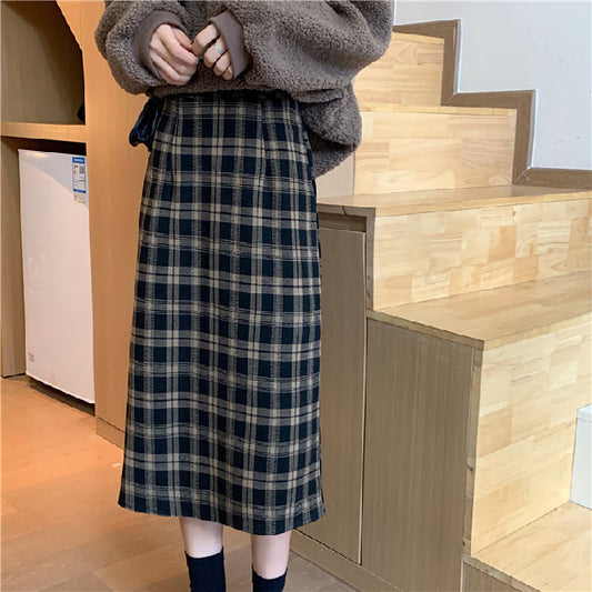 Woolen Plaid Slim Mid-length High-waist Retro Skirt