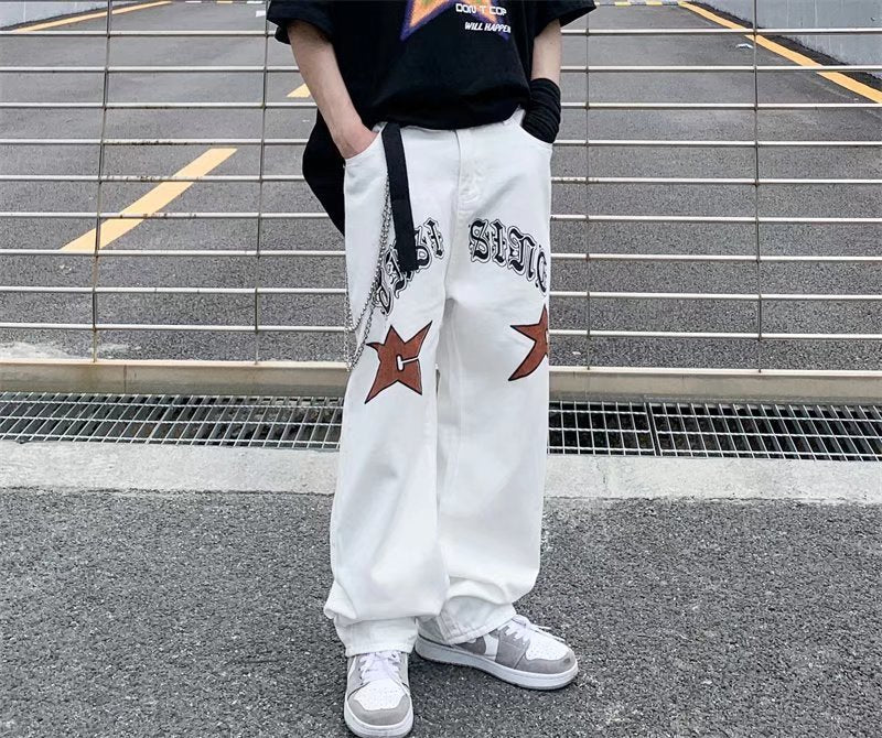 Retro Love Gothic Printed Jeans For Men And Women Loose-fitting Wide-leg Trousers